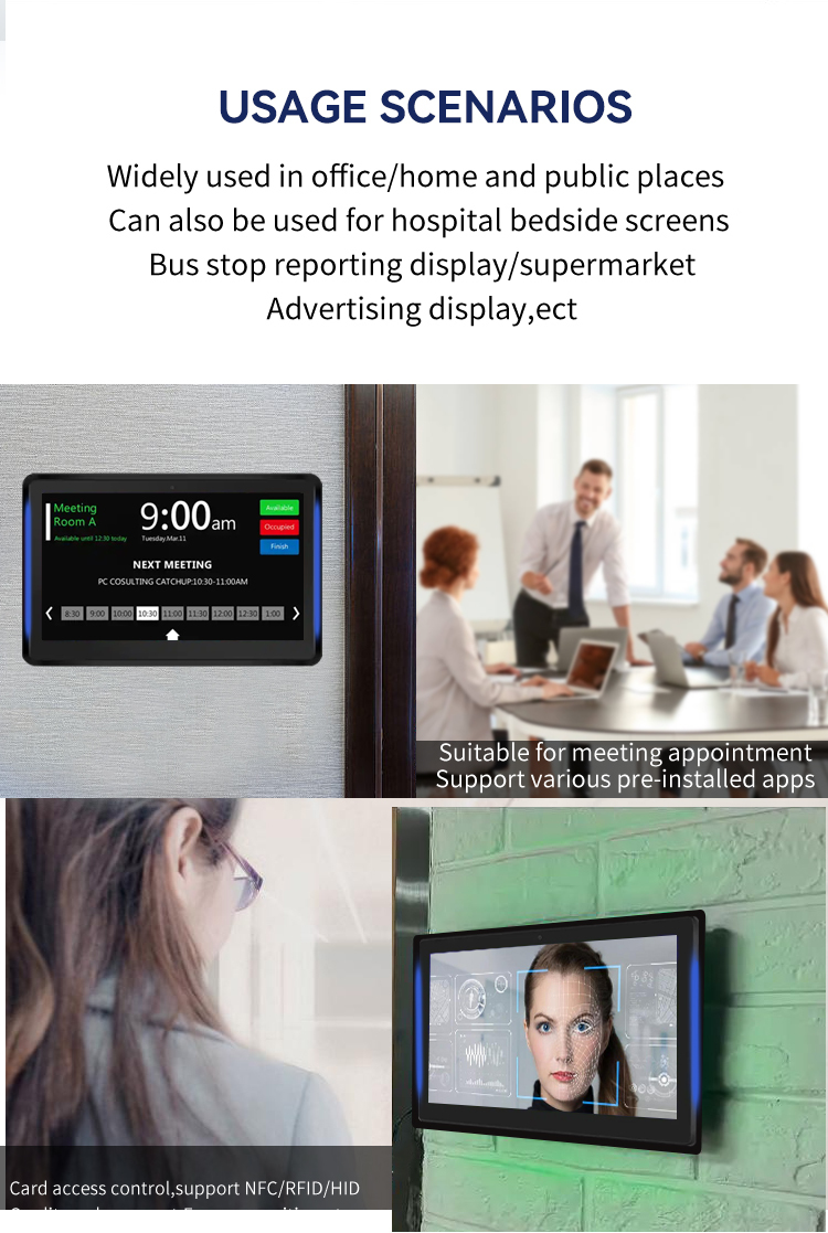 Αυτό το tablet δεν είναι μόνο ιδανικό για κράτηση αίθουσας συνεδριάσεων, αλλά αποδίδει επίσης εξαιρετικά ως ψηφιακός παίκτης σήμανσης, έξυπνος τερματικός σταθμός ελέγχου πρόσβασης ή διαδραστικό περίπτερο σε εταιρικά κτίρια, ξενοδοχεία, νοσοκομεία και εκπαιδευτικά ιδρύματα. Για τους ενσωματωτές και τους διανομείς, προσφέρει μια ευέλικτη λύση που καλύπτει πολλαπλές απαιτήσεις έργων με μια ενιαία πλατφόρμα υλικού.
